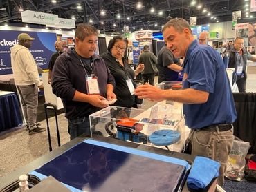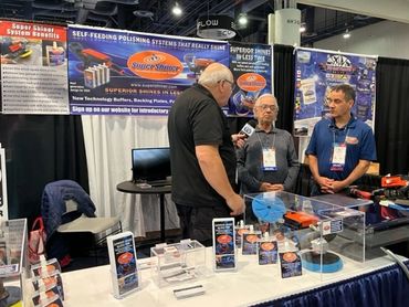 Our introductory product line includes a patent pending new technology surface care system designed for detailers. It is comprised of a self-feeding rotary buffer, new design backing plates, spiral foam buffing pads and specially formulated Nano-Tech polishing compounds. This system works together to save one third the time to do a job. On the drawing board for next year is an all-new, lighter, ergonomic self-feeding buffer.